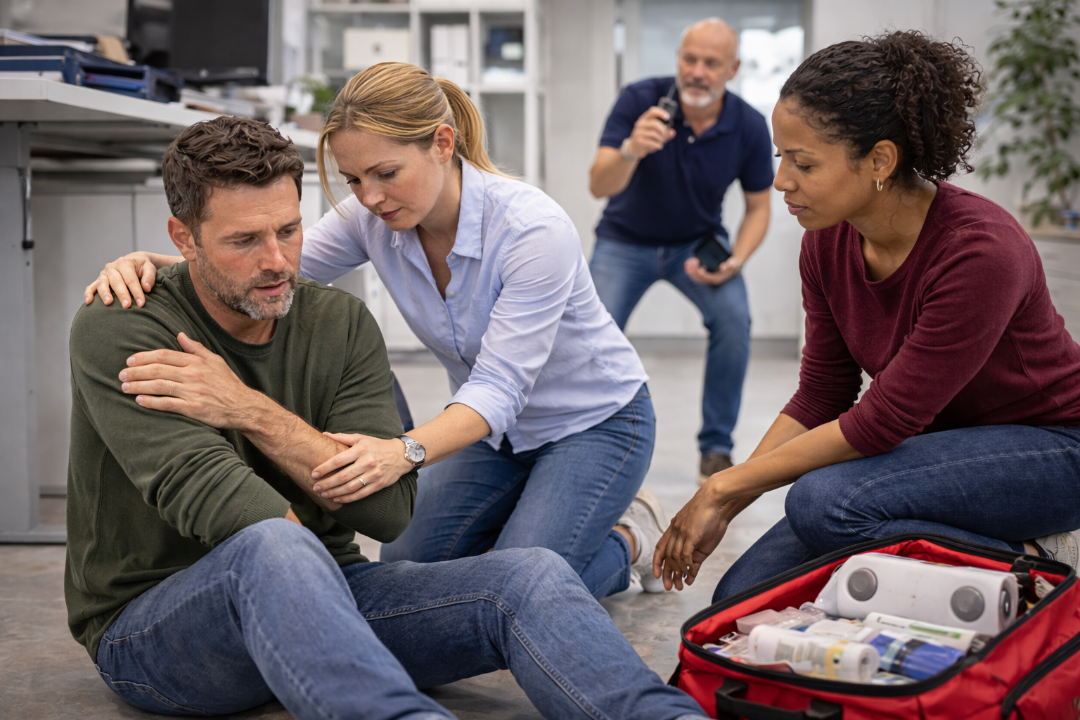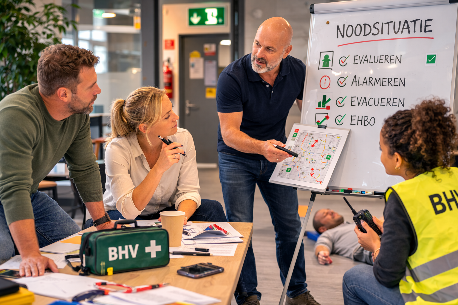 Tijdens de BHV herhaal cursus oefen je opnieuw met noodsituaties op de werkvloer, zodat je kennis en vaardigheden actueel blijven.